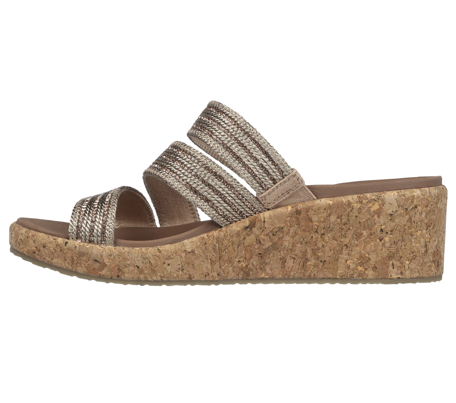 Easy-wearing comfort and support combine in Skechers Cali® Arch Fit® Beverlee – Always Classy. This vegan slide wedge sandal features a metallic knit rope upper with an Arch Fit® footbed.
