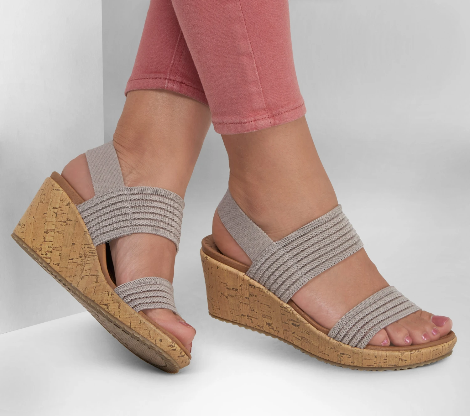 Summery style and absolute comfort combine in Skechers Cali® Beverlee – Sheer Luck. This wedge sandal features an engineered mesh upper with a stretchable slingback strap and a cushioned Luxe Foam® footbed.