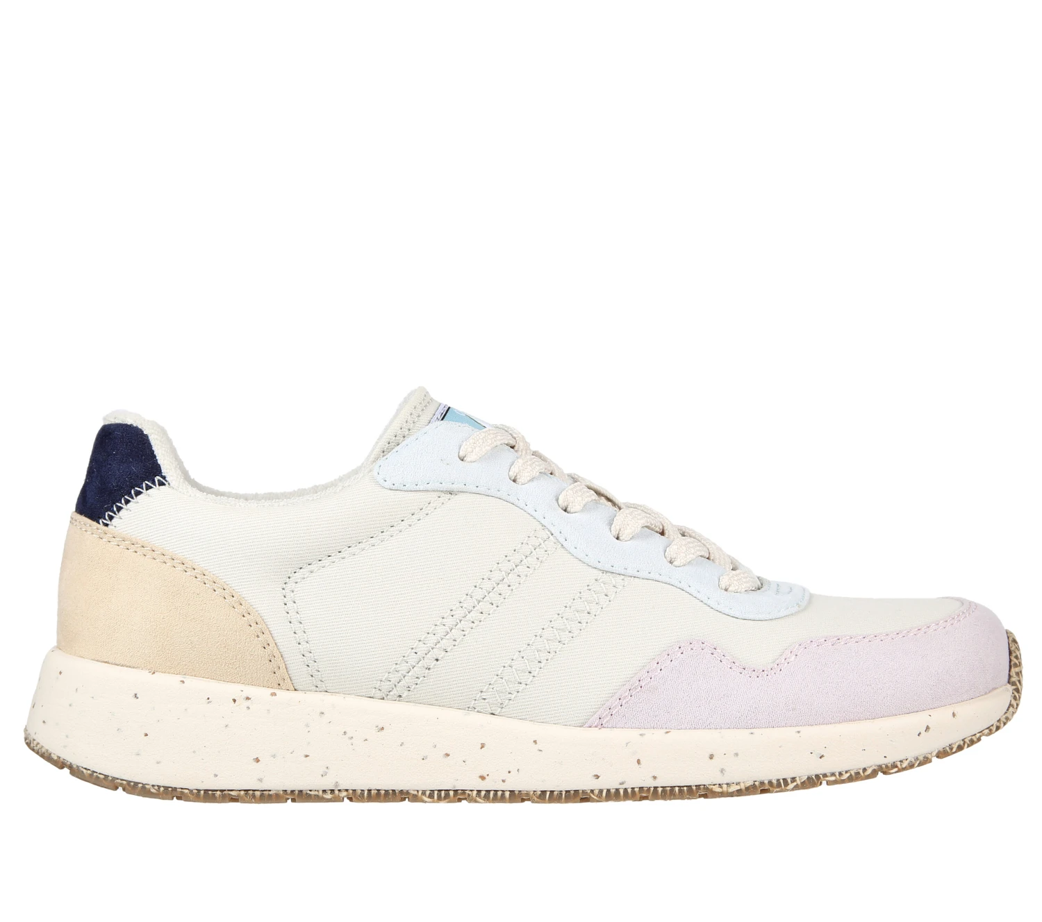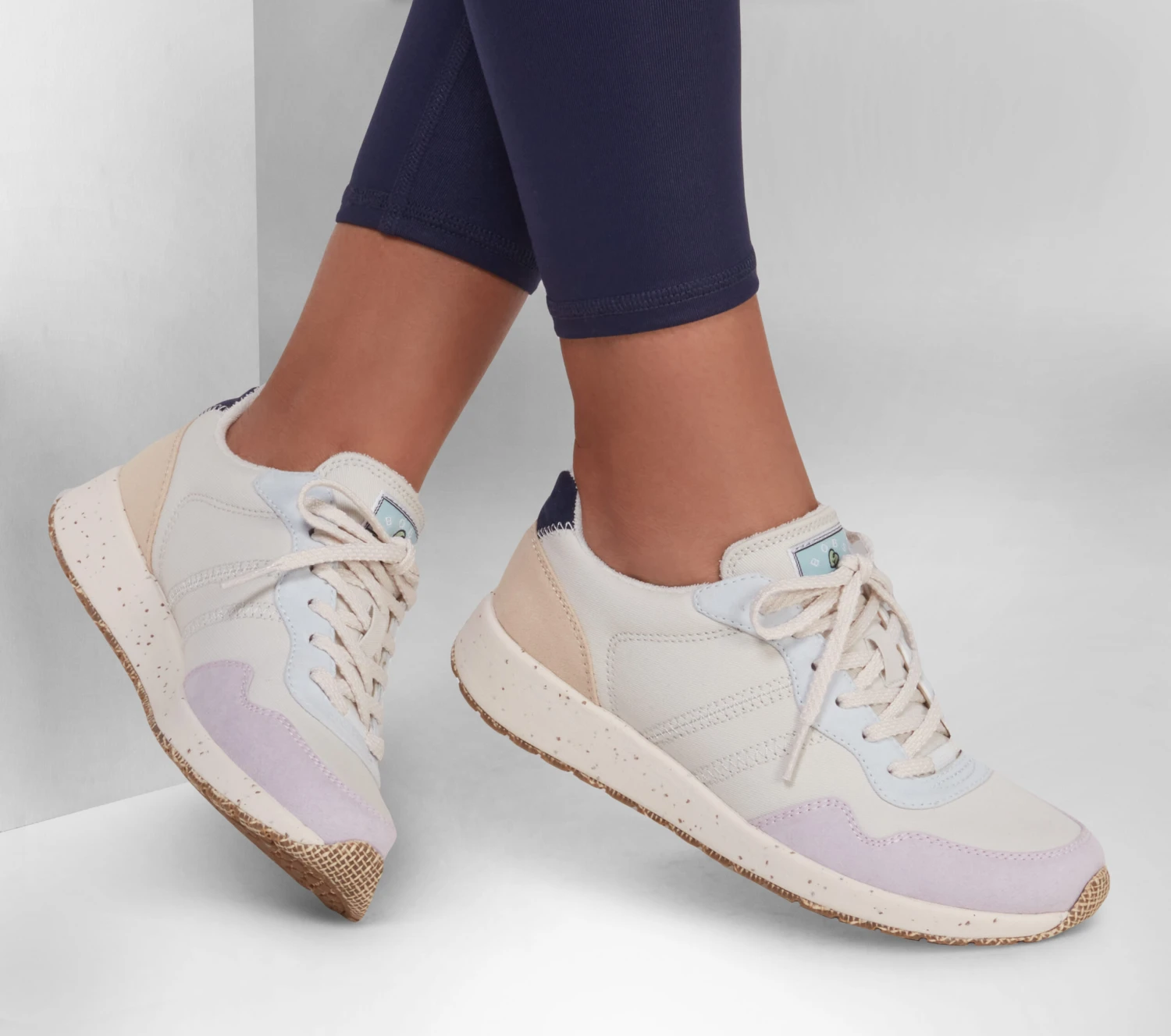 Go green in comfortable and eco-friendly style wearing BOBS from Skechers BOBS Groove – Club Change. Designed with recycled materials, this lace-up features a synthetic microsuede and woven fabric upper with a cushioned Skechers Memory Foam comfort insole. Our Planet Matters: Good for your feet. Good for the world.