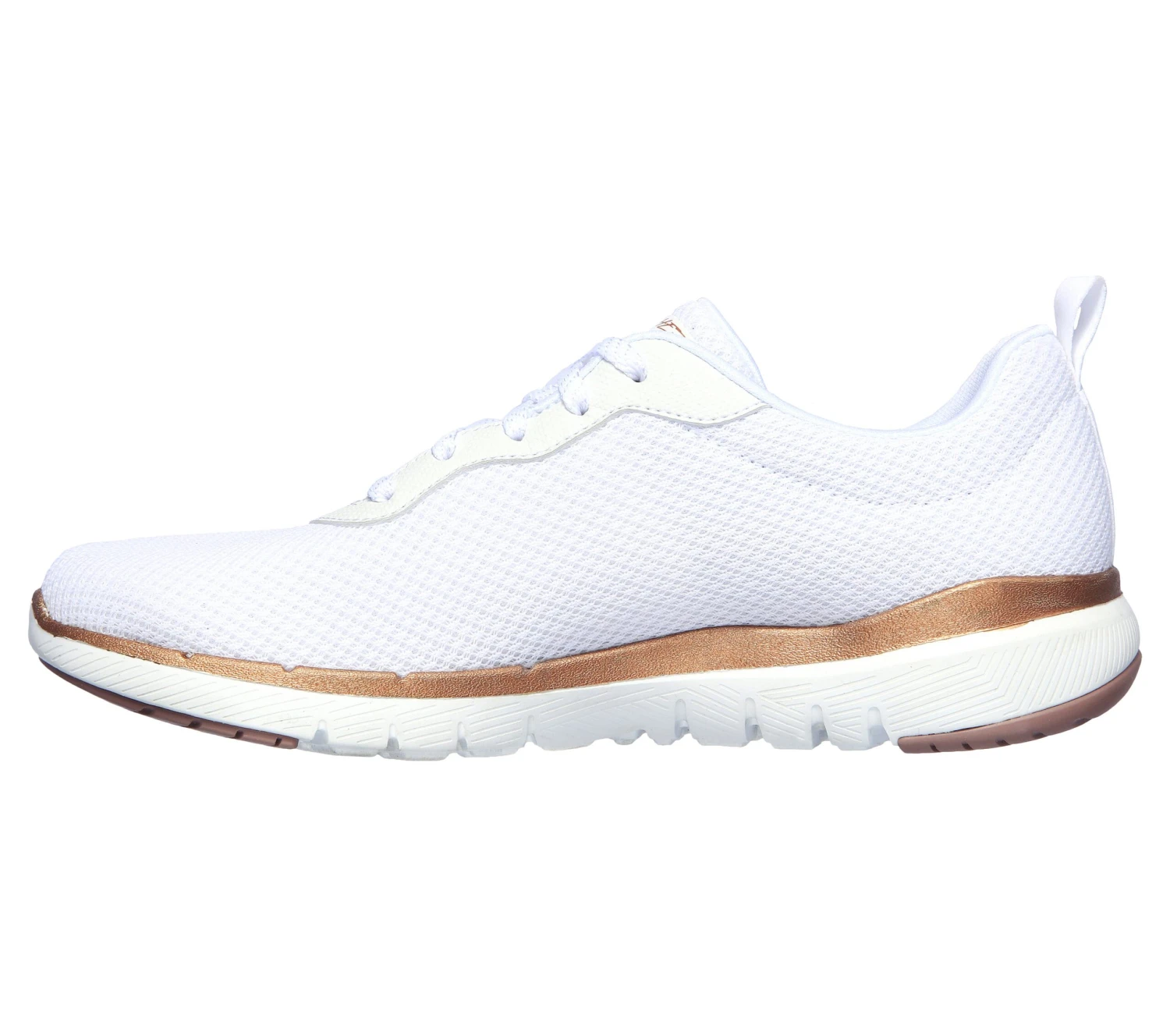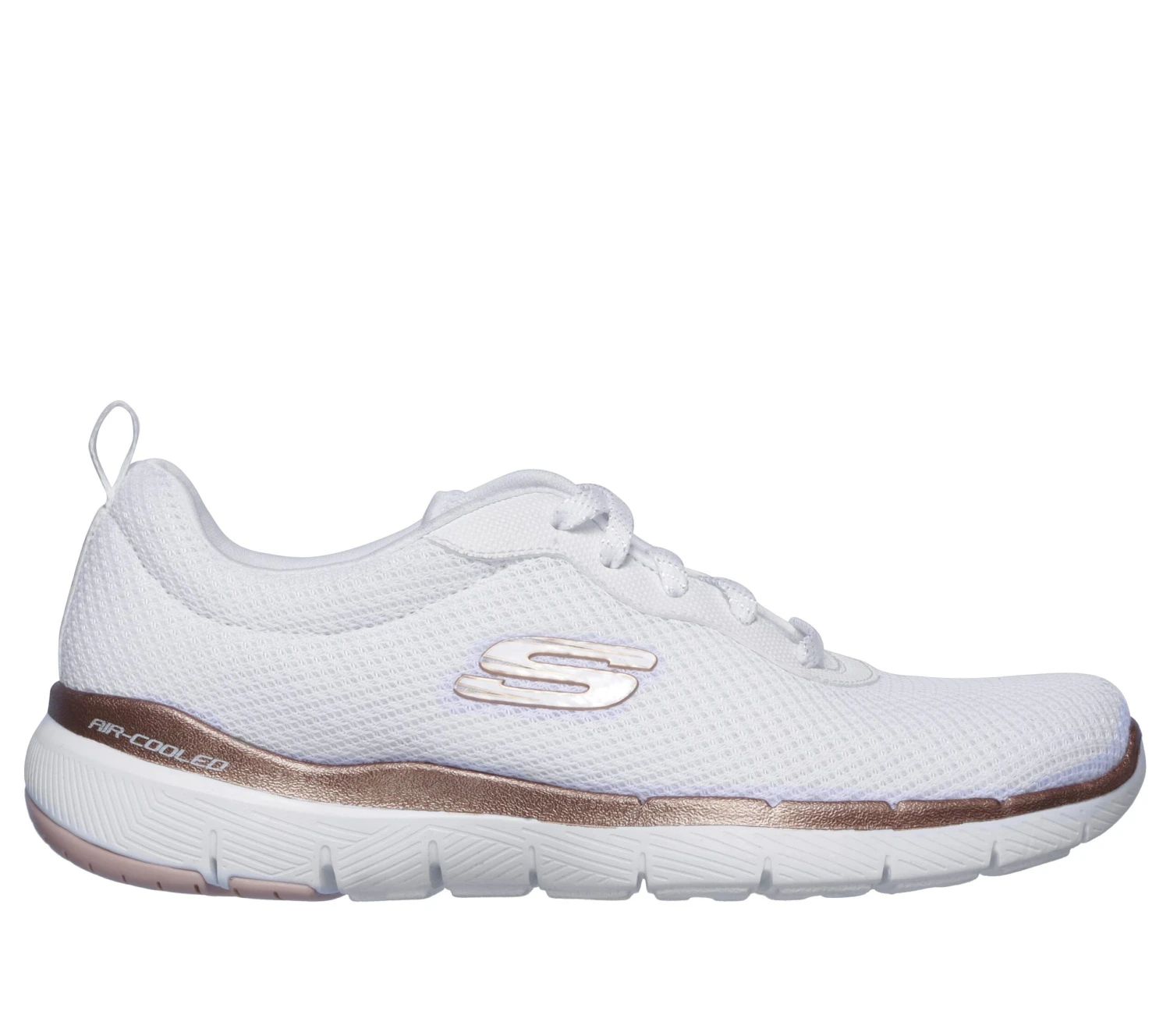Take the lead in athletic stylish comfort with the Skechers Flex Appeal 3.0 – First Insight shoe. shoe. This lace-up sneaker features a soft flat mesh knit upper with a synthetic trim and cushioned Air-Cooled Memory Foam® insole.