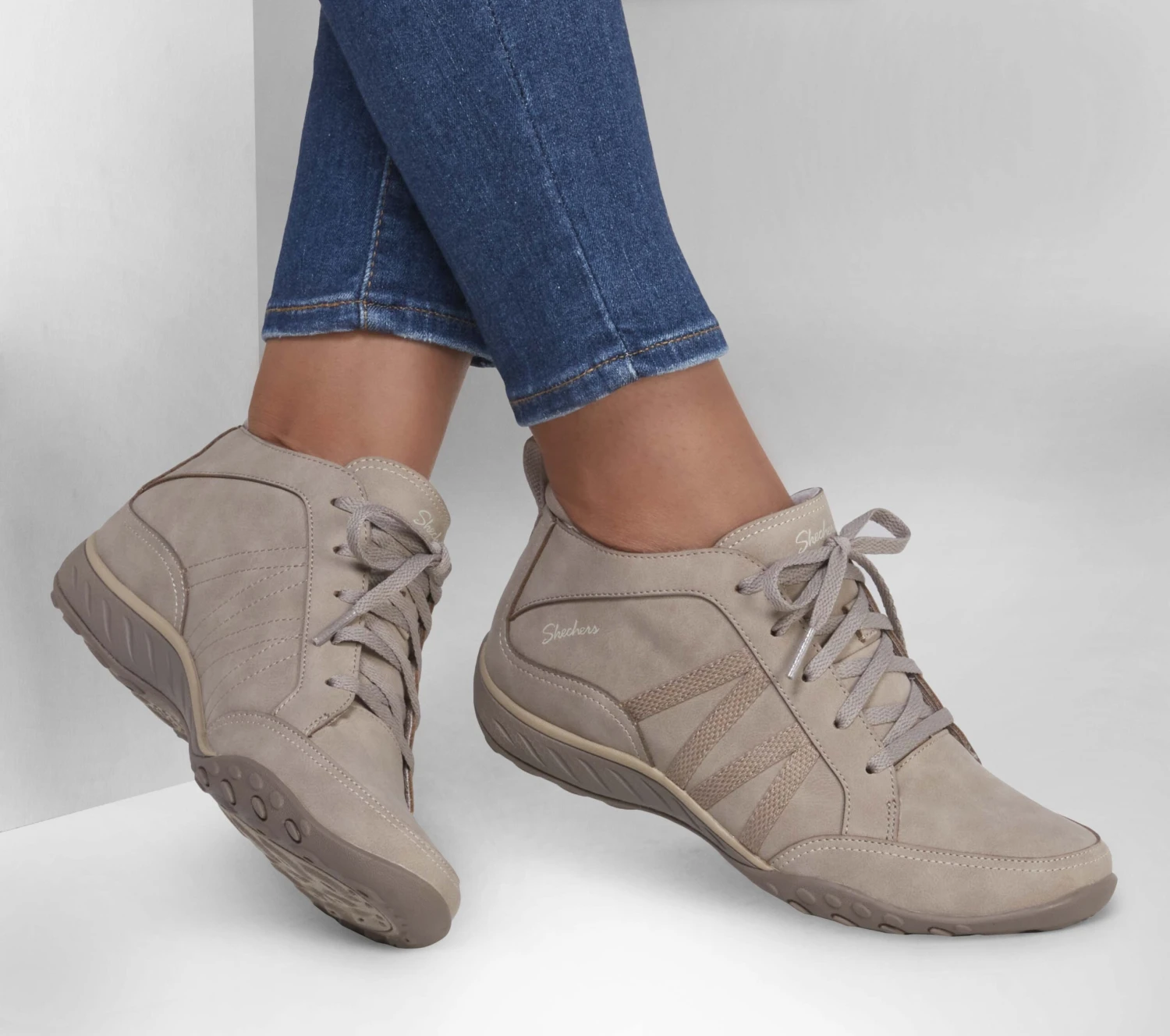 Stay comfortable in neutral casual style wearing Skechers Relaxed Fit®: Breathe-Easy – Friendly Ties. This lace-up chukka style bootie features a synthetic leather upper and a Skechers Air-Cooled Memory Foam® insole.
