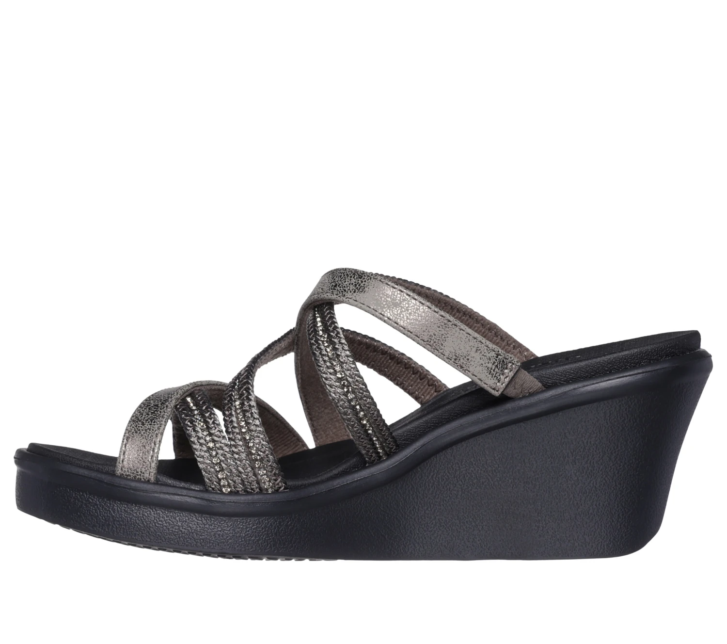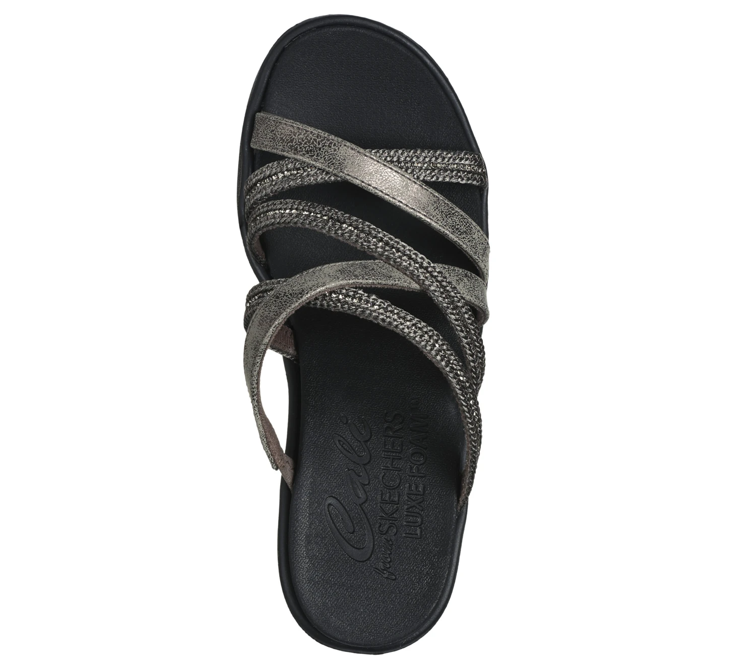 Sunny-weather glitz combines with easygoing comfort in Skechers Cali® Rumble On – Classy Way. This classic wedge sandal features a synthetic knit upper with woven metallic detail, and a cushioned Luxe Foam® footbed.