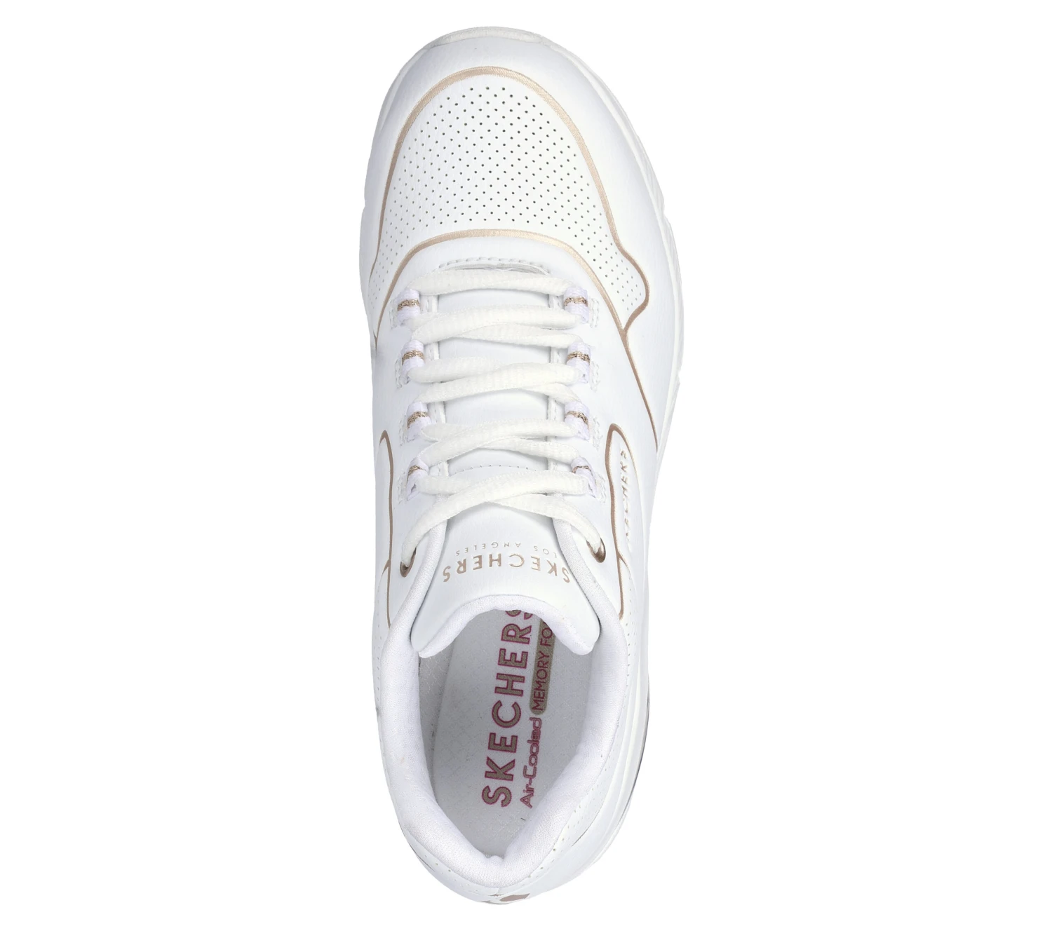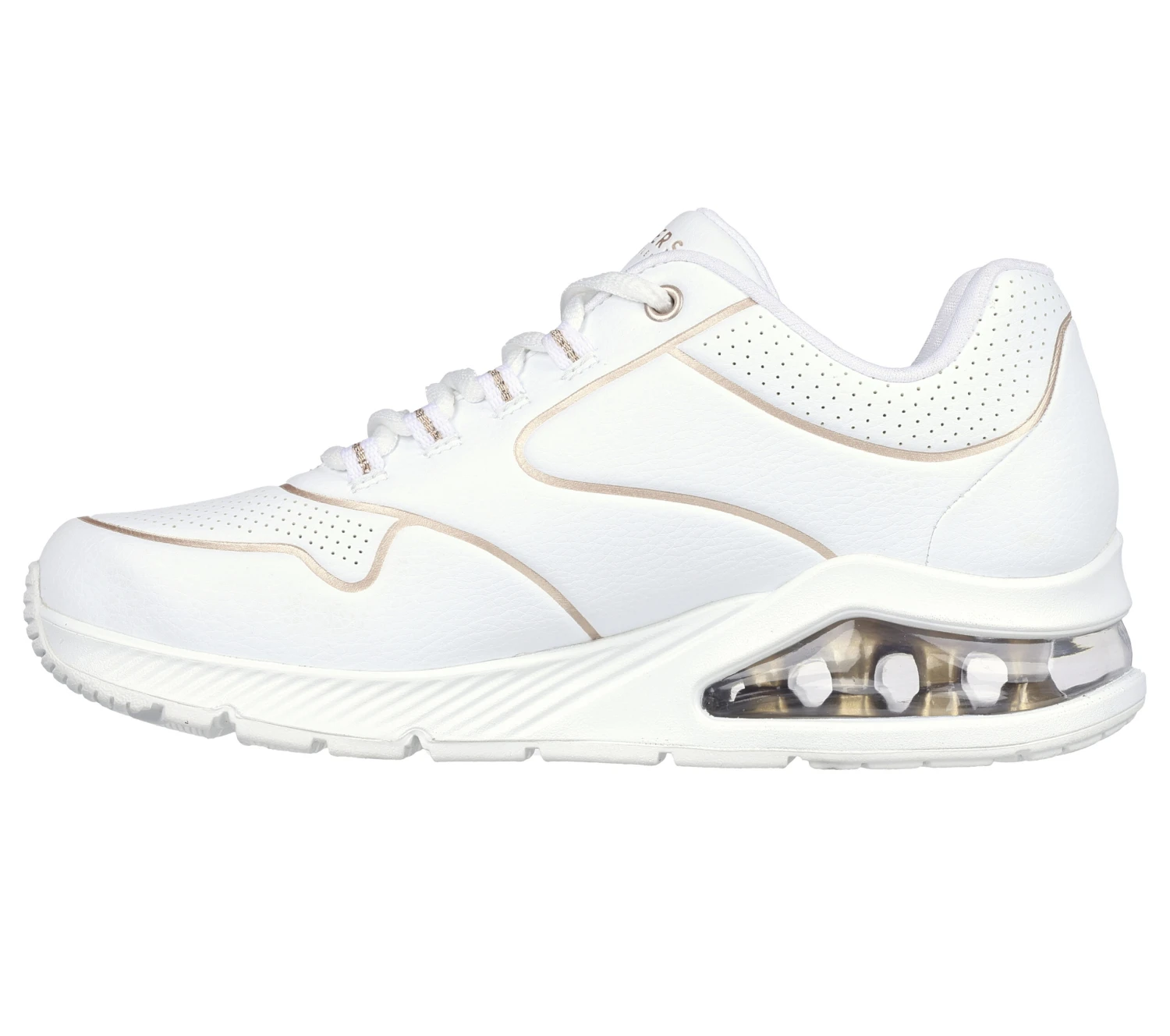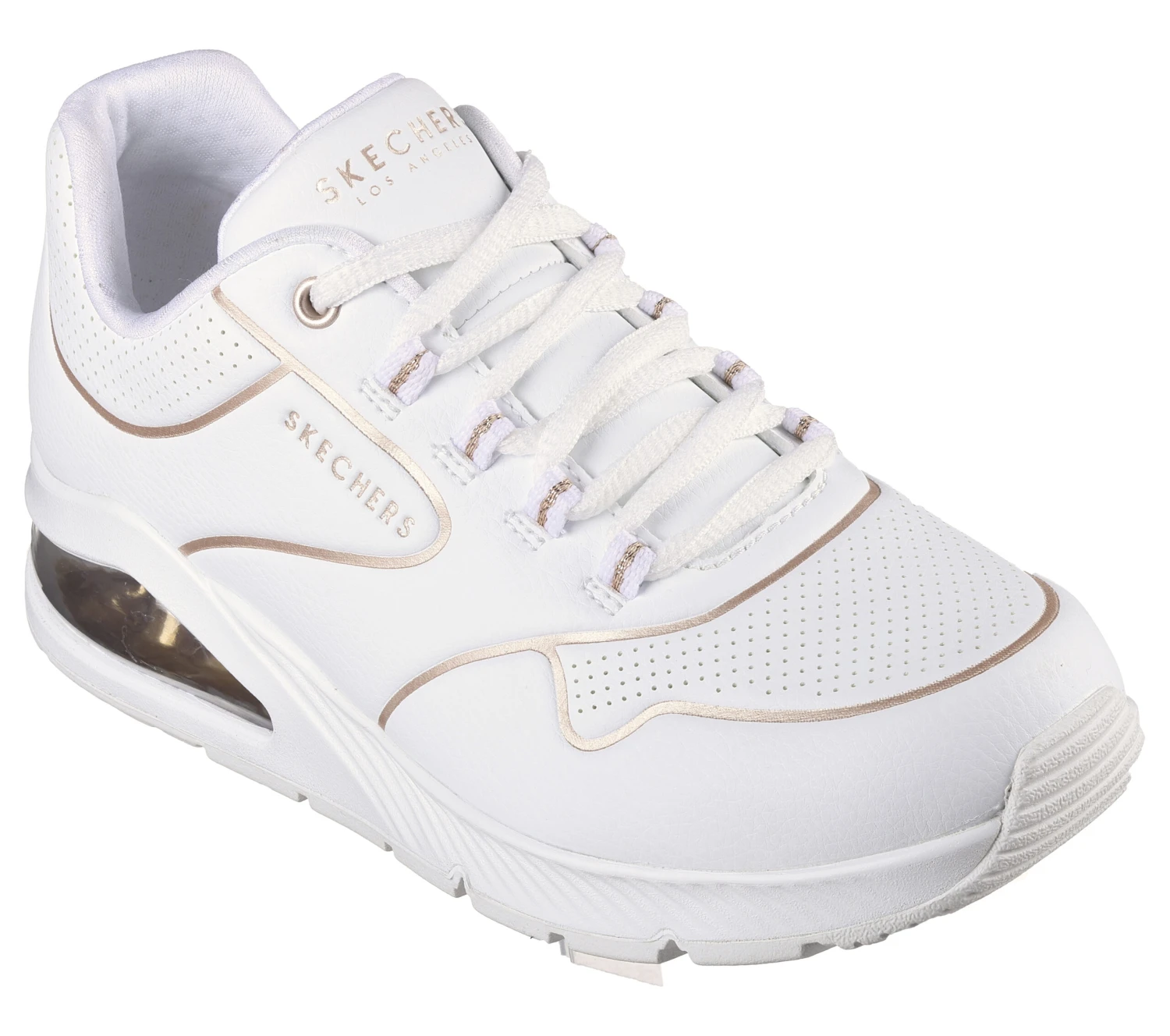 Stand out with a luxe statement in Skechers Street Uno 2 – Golden Trim. This fashion lace-up features a synthetic durabuck upper with gold trim detailing, Skechers Air-Cooled Memory Foam® insole and a visible Skech-Air® airbag midsole.