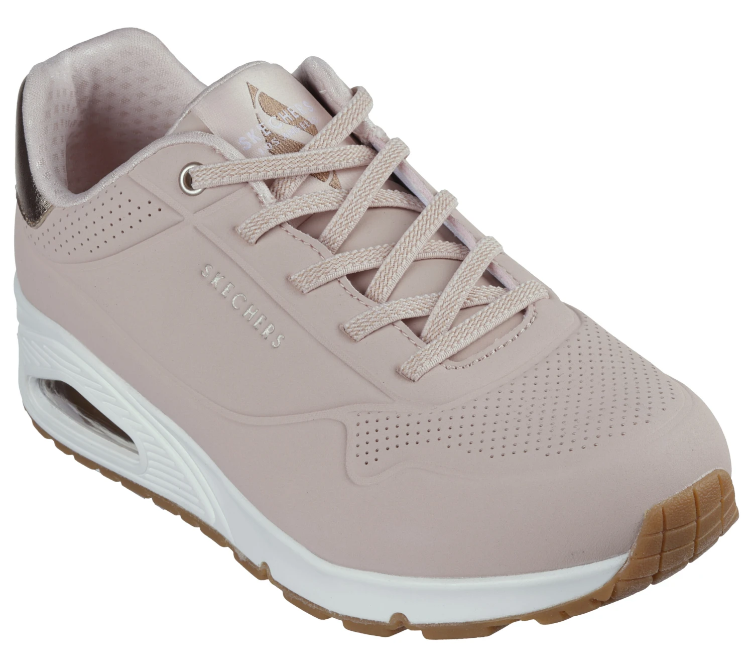 Slip-on a classic style in comfort wearing Skechers Street Uno – Shimmer Away. This fashion sneaker features a synthetic durabuck upper with a metallic trim, stretch laces, Skechers Air-Cooled Memory Foam® insole and Skech-Air® visible airbag midsole.